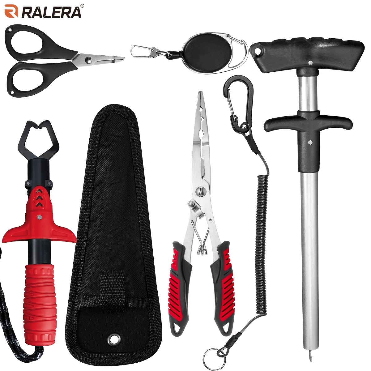 TEMU RALERA 7피스 낚시 도구 세트, 물고기 입술 그리퍼 및 훅 제거기 포함, 낚시 그리퍼, 낚시 플라이어, 낚시줄 커터, 쇼크 코드, 훅 디고저, 보관 가방, 스냅 훅, 낚시꾼과 아웃도어 애호가를 위한 이상적인 선택