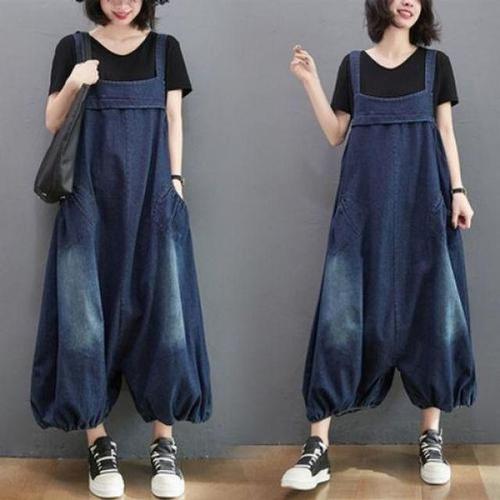 ANYOU 작은 키 감령 패션 헐렁헐렁 캐주얼 멀티 포켓 허리 옆 밴딩 조절 데님 멜빵치마 여하