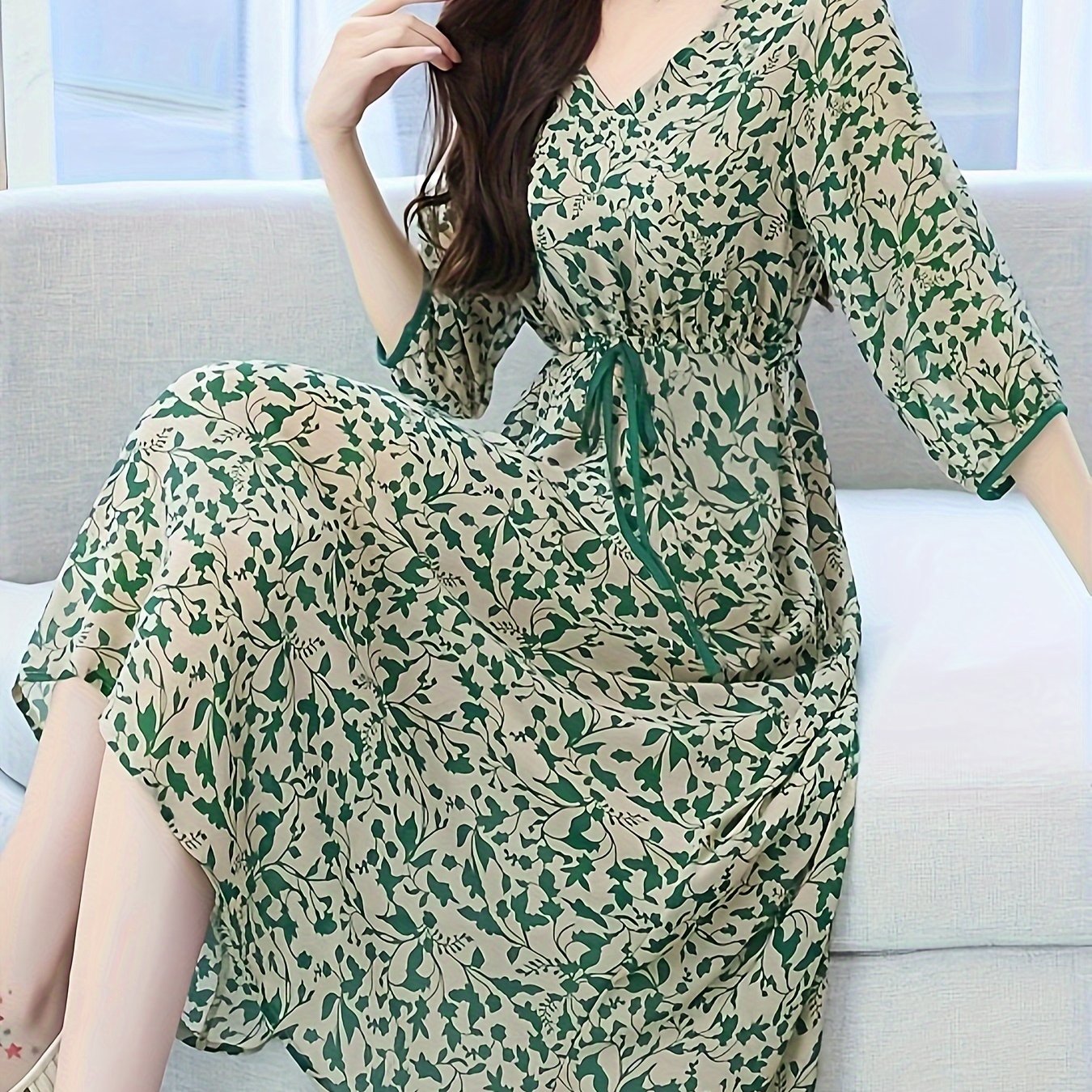 TEMU 여성용 V넥 플로럴 프린트 드레스 - 조절 가능한 허리 끈, A라인 소매, 세탁기 사용 가능, 가볍고 통기성 좋은 소재, 캐주얼 & 포멀 행사용, 매끄러운 질감 마감