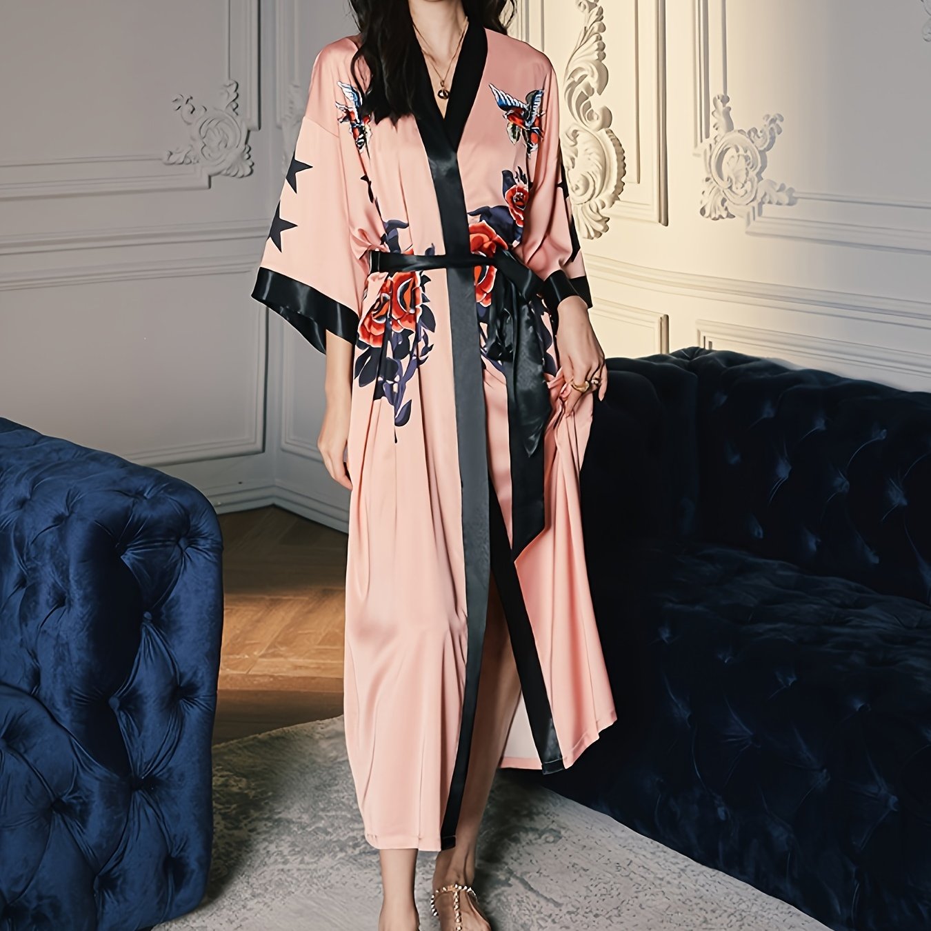 TEMU 봄 가을 여성 중국풍 꽃과 새 프린트 V넥 우아한 가운 수면가운 홈 가운