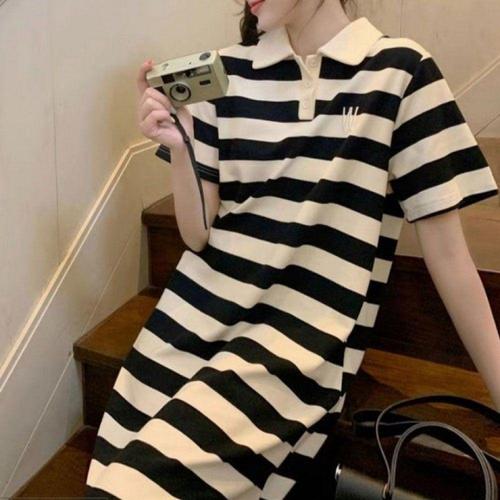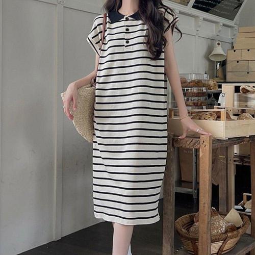 여름용 스트라이프 반팔 카라 롱 원피스 이지웨어 WFLLQXA