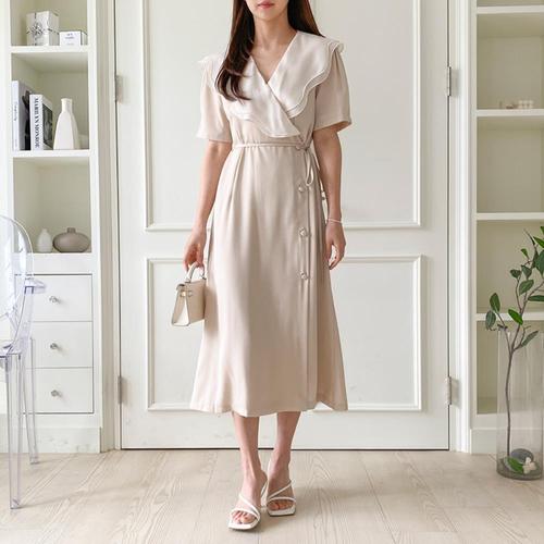 [옷자락] [시즌오프]러플 케이프 카라 롱 플레어 반팔 랩 원피스_5