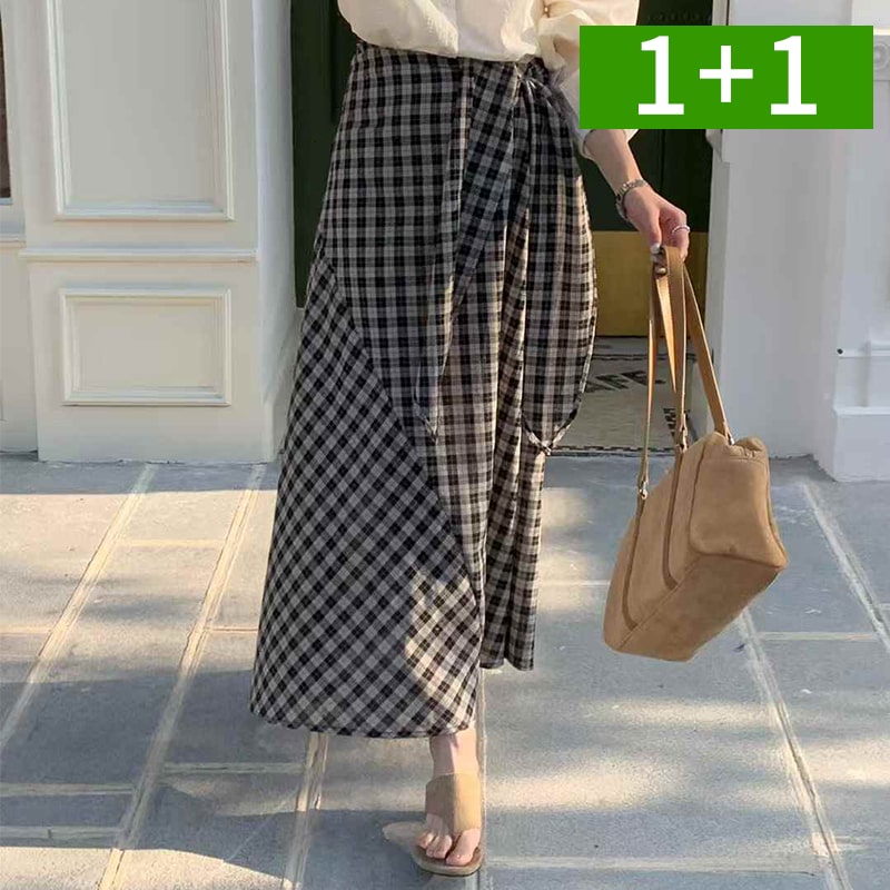 1+1 체크 플레어 면 치마 여성 롱 스커트