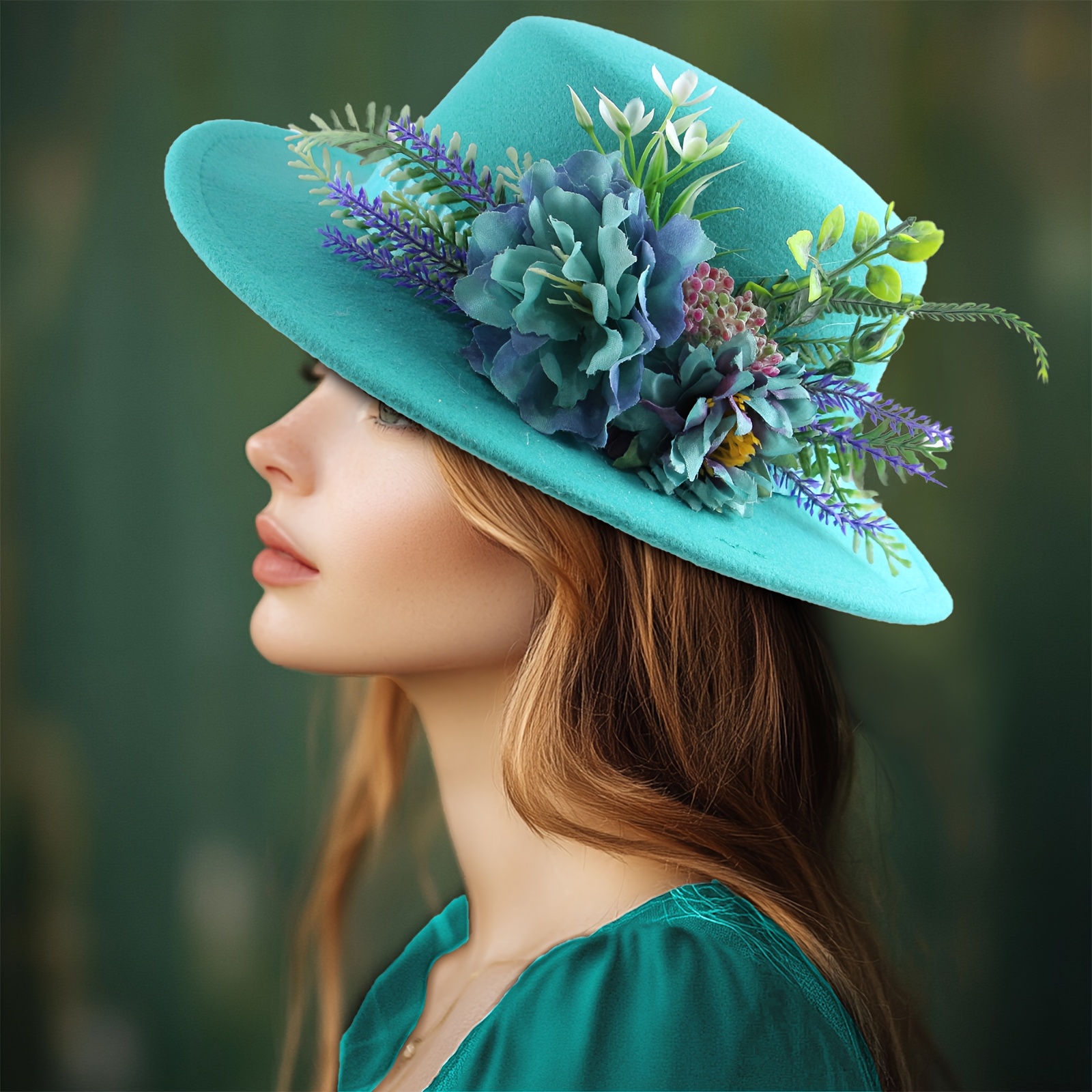 TEMU 1개 여성 패션 넓은 챙 페도라 모자 호수 파란색 꽃잎 자수 우아한 햇빛 가리개 웨딩 바캉스 어버이날 선물 해변 모자
