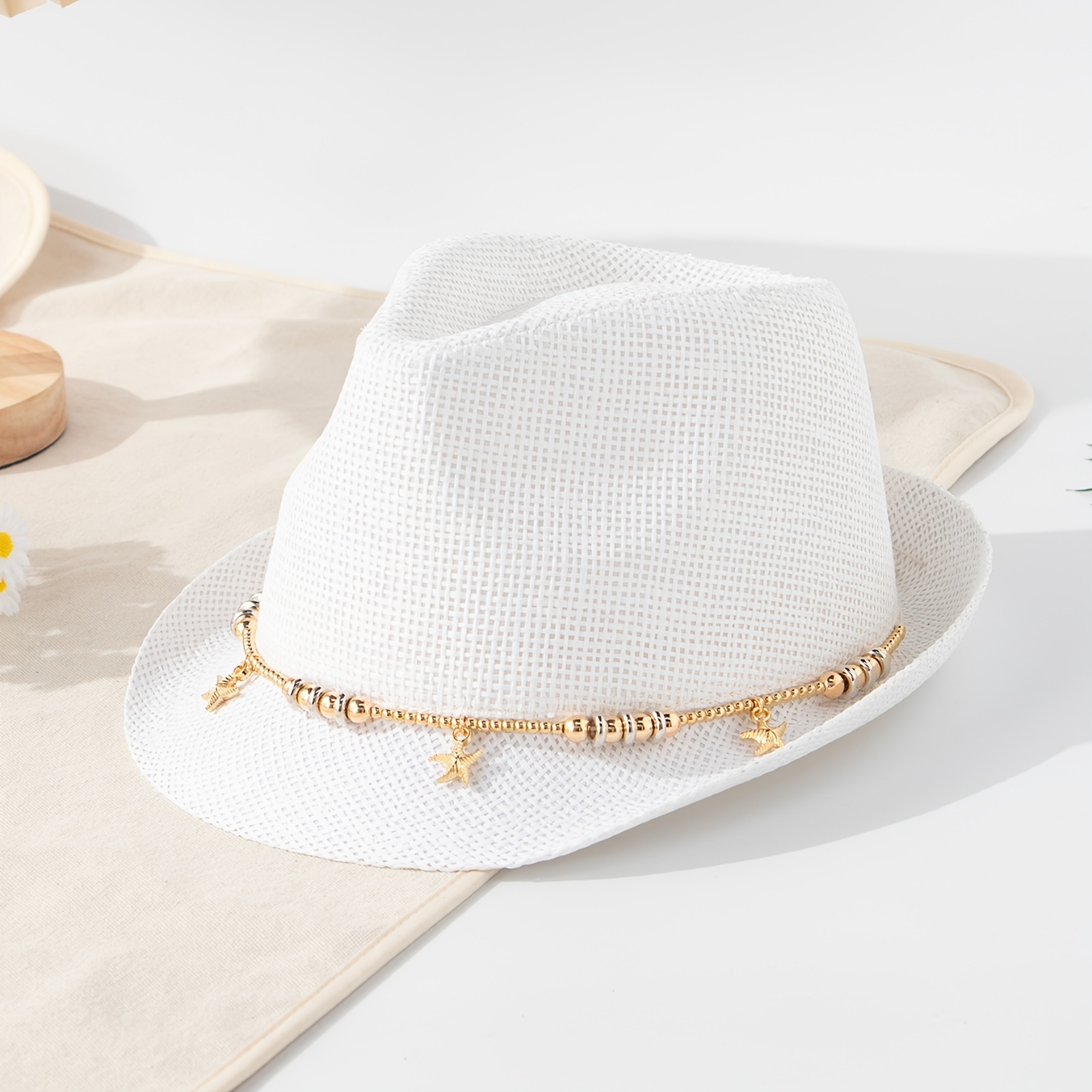 TEMU 별모양 구슬 장식 체인 바다 요소 해변 선캡, 해변 휴가 햇빛 가리개 작은 챙 데님 모자, 해변 스타일 데님 페도라