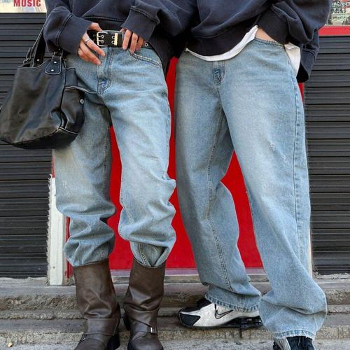 [옷자락]여자 남자 커브드 맥시 와이드핏 캣워싱 커플 청바지