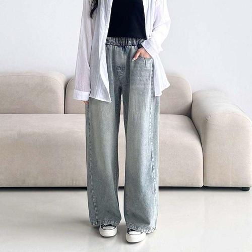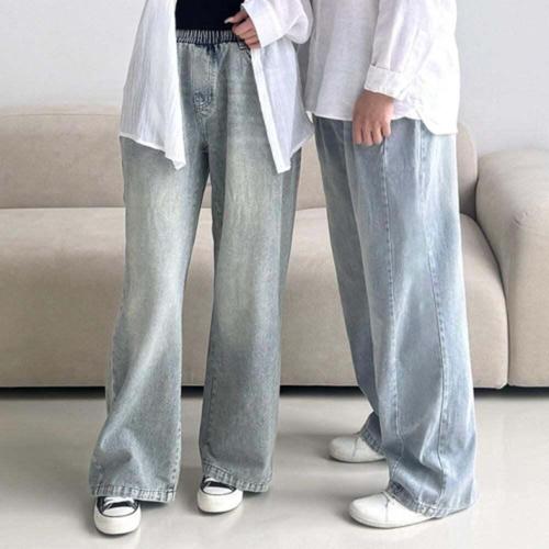 청 데님 커플 긴바지 허리밴딩 팬츠 남녀공용 사이드턱 와이드 WFKNZMP