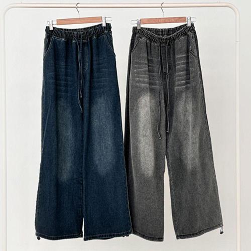 남녀공용 커플 데님 와이드 허리끈조절 캐주얼 스타일 밴딩 팬츠 WFL0M5A