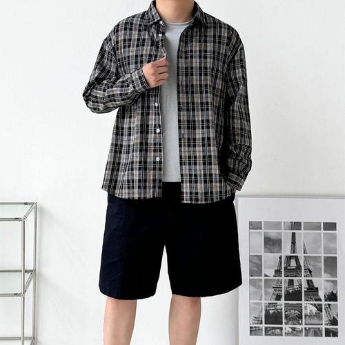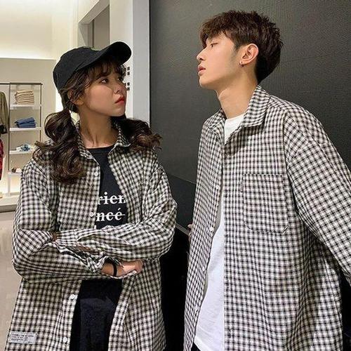 [다잇템]남녀공용 커플템 학생 오버핏 체크 긴팔 셔츠