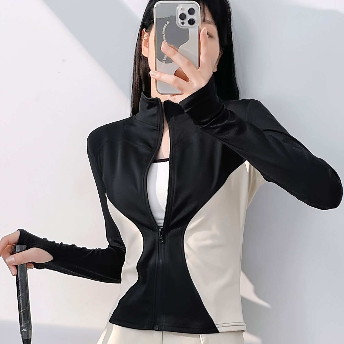 TEMU 여성용 롱슬리브 지퍼업 하이넥 라운드넥 컬러블록 디자인 탑, 구멍 포함