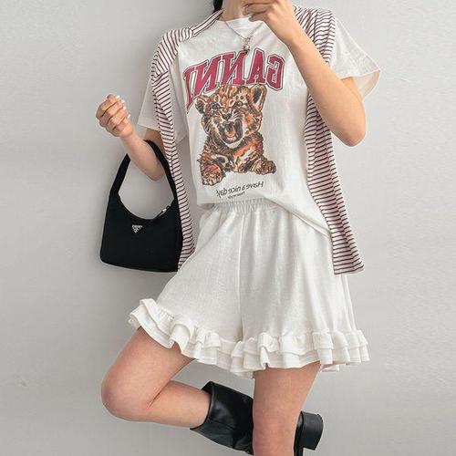 [신상오픈런]|KSP9665|여성용 봄 시즌 프릴 장식 와이드핏 밴딩 큐롯 반바지
