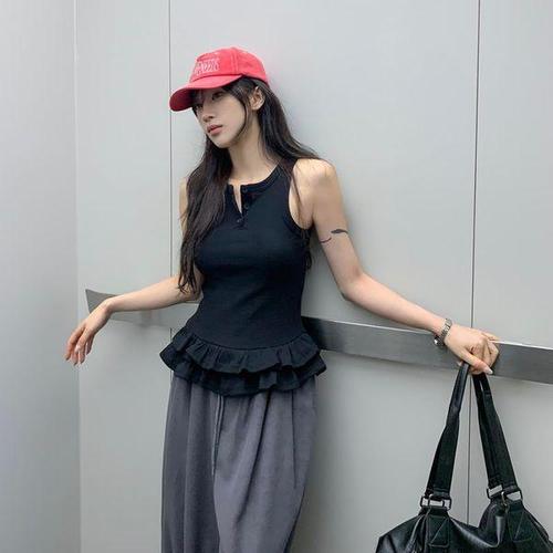 [옷자락]여자 데일리 헨리넥 골지 캉캉 프릴 크롭 민소매