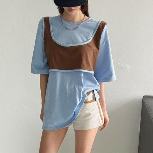 [옷자락] 여자 레이어드 배색 크롭나시 슬릿 루즈 박시티 세트