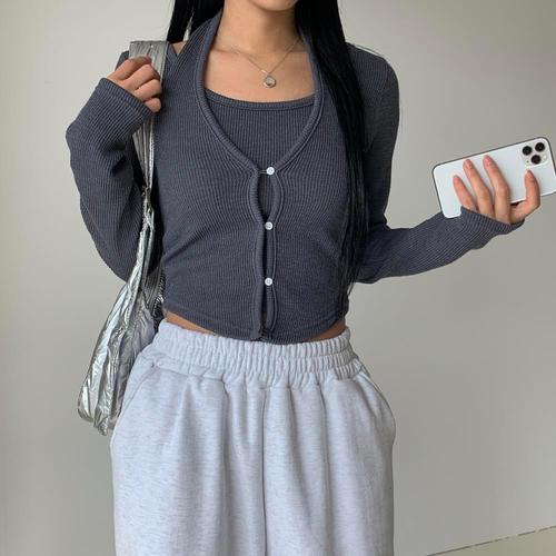 [옷자락]여자 크롭 홀터 버튼 나시 골지 티셔츠 세트