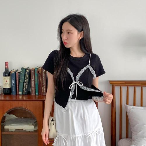 [옷자락]여자 골지 크롭 레이스 나시 투피스 레이어드 세트