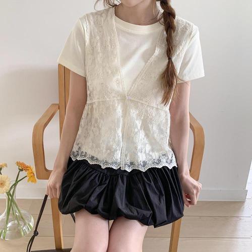 [옷자락]여자 플라워 레이스 조끼 세미 크롭 반팔티 세트