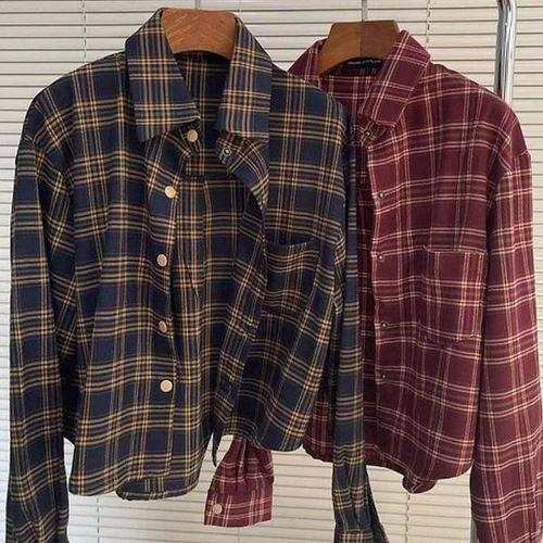 [하프클럽/] 여성 가을 크롭 체크 앞포켓 귀여운 데일리 긴팔 셔츠 남방