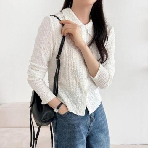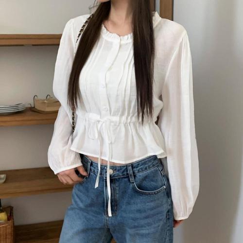 [옷자락]여자 라운드 카라 엠보 크롭 긴팔 셔츠 블라우스