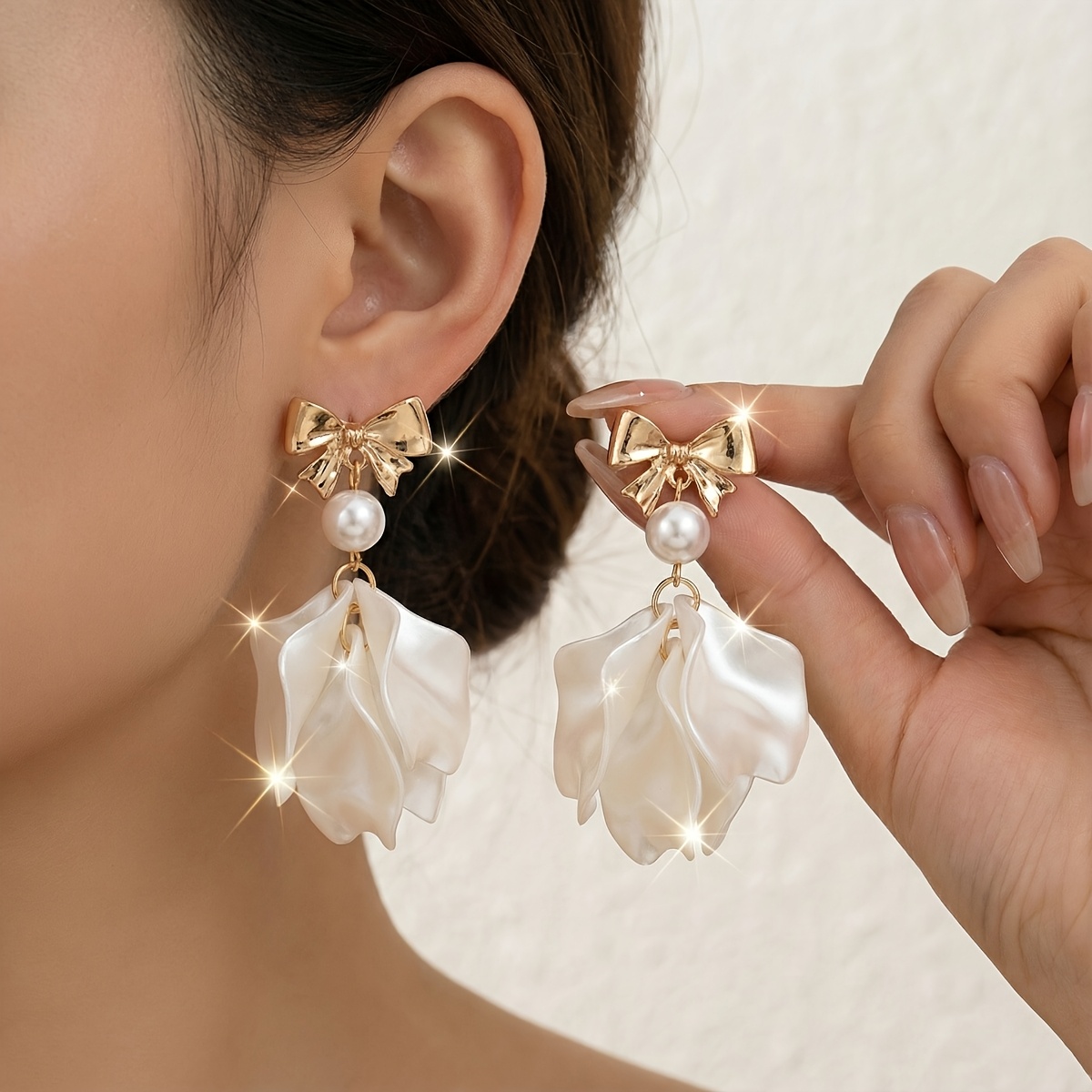 TEMU 1쌍의 우아한 화이트 여성 플로럴 귀걸이, 트렌디하고 다재다능한 디자인, 골드 톤 아연 합금 리본 귀걸이, 여성 봄/여름 , 캐주얼 파티, 결혼식에 적합