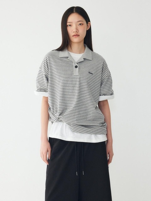 [스튜디오 톰보이] 스트라이프 오버핏 카라 티셔츠_멜란지 그레이 9176222997