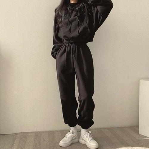 [셀럽하우스]트레이닝 QVKQ8153 셋업 크롭후드 조거팬츠 세트 크루 러닝복