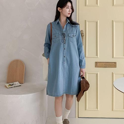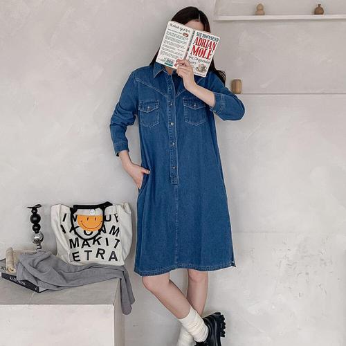 [미라클세븐]여성 두 개 주머니 반오픈 카라형 밑트임 데님 중간 길이 원피스