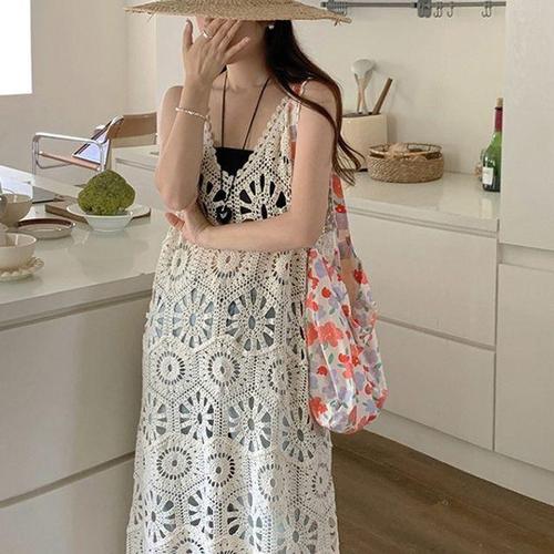[셀럽하우스]여름 FJOJ5331 펀칭 데일리 롱 니트 클래식 원피스 나시 휴양지