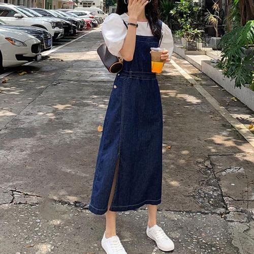 [무드무드] 니보라 데님 뒷트임 멜빵 롱 원피스