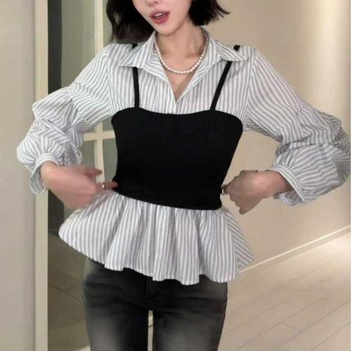 [옷자락] 여자 레이어드 뷔스티에 스트라이프 페플럼 블라우스