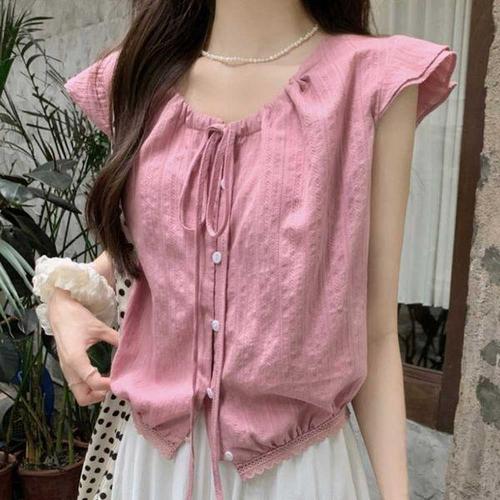 [삐까삐까]여름 프릴 주름 반팔 블라우스티 레이스 퍼프소매 라운드 링클프리 티셔츠