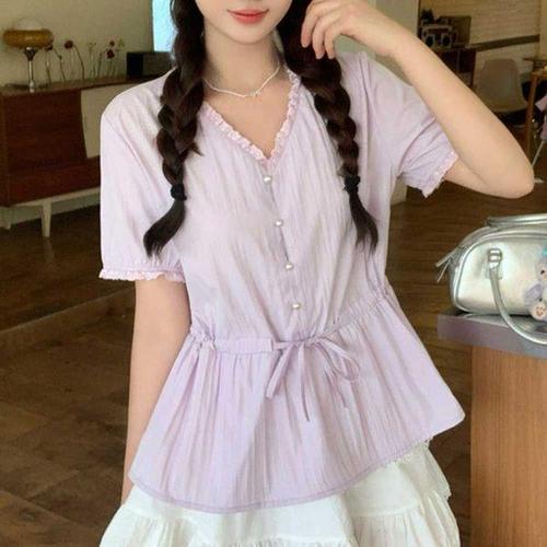 [에이치플러스몰]여성 셔링 프릴 반팔 블라우스 데일리 티셔츠 주름