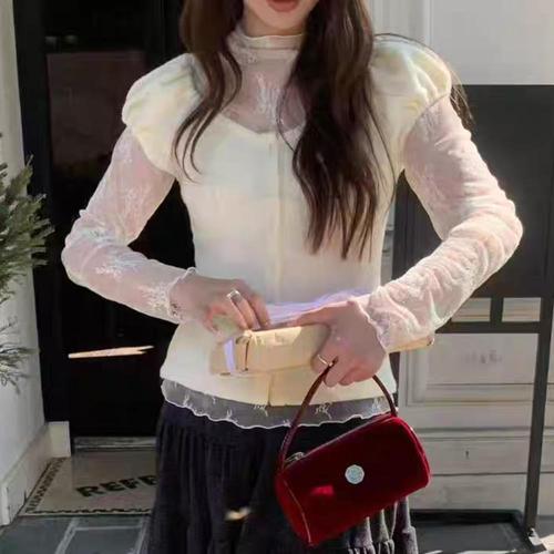 [옷자락]여자 데이트룩 로맨틱 퍼프 레이스 크롭 가디건