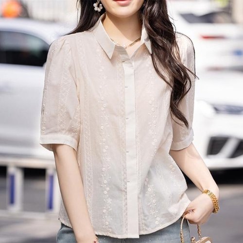 여름 브이넥 셔츠 블라우스 페미닌 펀칭 플라워 자수 WFKBXA1