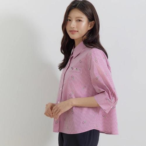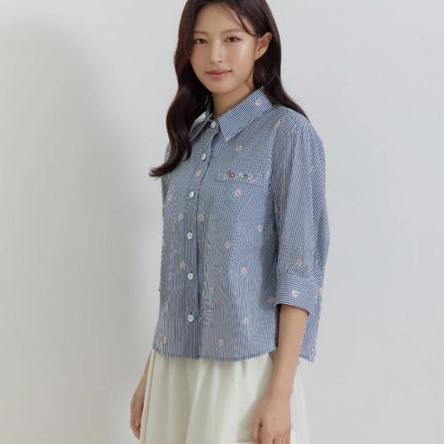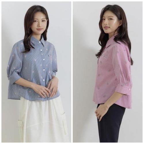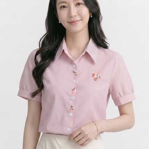 NB3155 러블리 스트라이프 플라워 자수 카라 반팔 셔츠