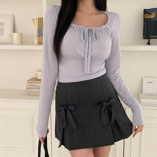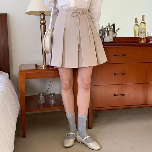 [옷자락]여자 캐주얼 무지 리본 플리츠 미니스커트