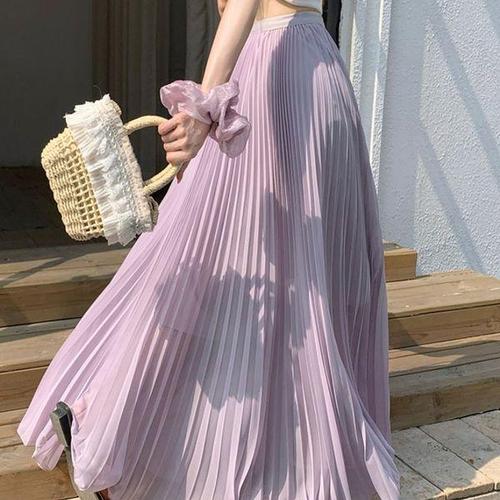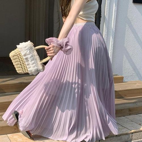 [드레스허그]라일락 쉬폰 플리츠 롱스커트