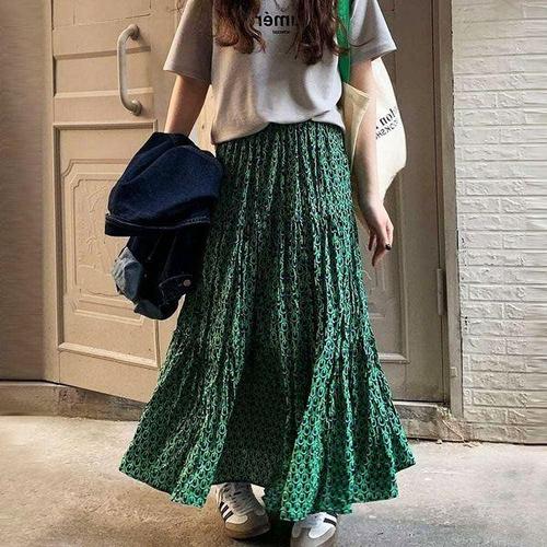 [에이치플러스몰]치마 스커트 긴 여성 롱스커트 플리츠스커트 롱 초록