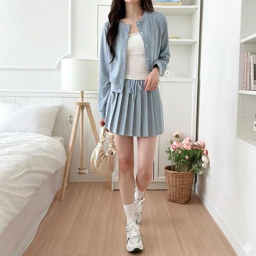 [옷자락]여자 라운드넥 버튼 가디건 플리츠 미니 스커트 코디 세트