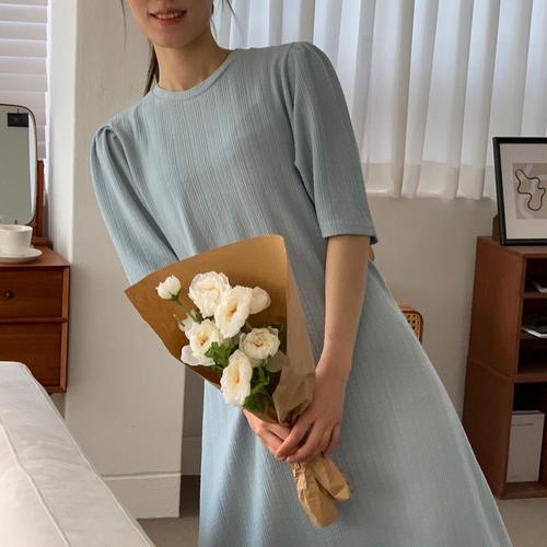 [미라클세븐]여성용 여름 하객 패션 스퀘어넥 퍼프 소매 하늘색 긴 원피스