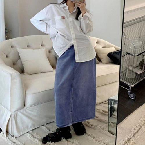 하이웨스트 긴 청 데님 스커트 봄가을 여성용 WFLLR1C