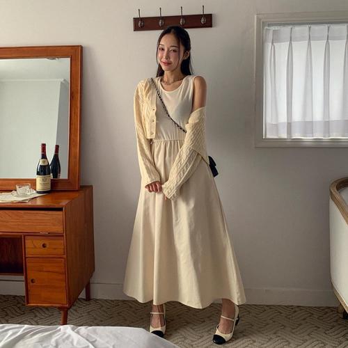 [옷자락]여자 라운드넥 민소매 하프 캉캉 롱 원피스