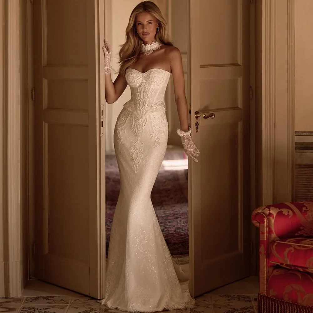 반짝이는 비즈 장식과 스팽글이 있는 맞춤형 신부 가운, 패셔너블한 스윗하트 아플리케 웨딩 드레스, 레이스 머메이드 베스티도 데 노비아
