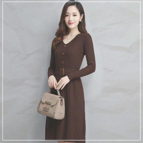 브이넥 골지 니트 원피스 허리벨트 긴팔 데일리 하객용 겨울 가을 WFLLR2J