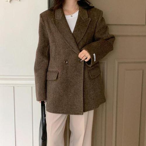 여자 오픈카라 핸드메이드 헤링본 울 자켓