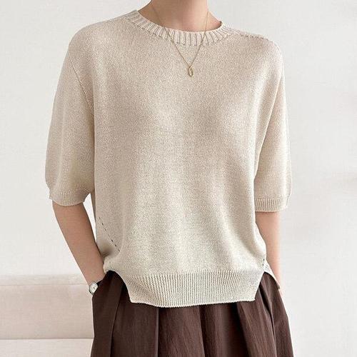 [H스타일](KN)홀가한지트임라운드니트티 봄 여름 여성