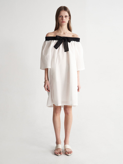 [까이에] 블랙 리본 오프숄더 화이트 원피스