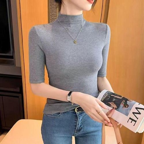 [옷자락]여성 봄 여름 5부 반팔 라운드넥 시스루 절개 티셔츠