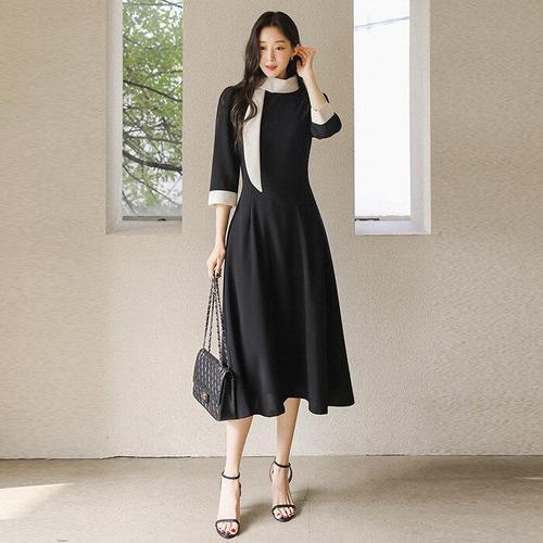[스타일온미][루이스엔젤] A라인 플레어 하트라인 배색 카라 퍼프 7부소매 롱 원피스