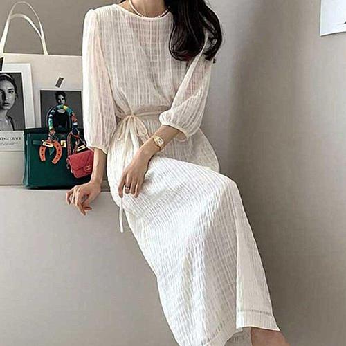 [신상오픈런]여자 무지 시스루 패턴 7부소매 허리끈 롱 원피스