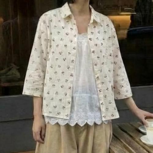 타임퓨어 춘추 여성 프린팅 남방 면마 셔츠 루즈핏 7부 블라우스 빈티지 문예 상의 빅사이즈 중년 엄마옷